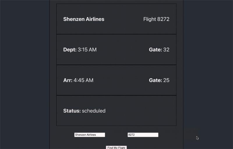 This looks great, but right now it only displays hardcoded data. To make it usable, we need the user to input their own flight number and airline. We’ll give them two text inputs to do that, and a button to send the request. Then we can send their information to the API and render what it returns.