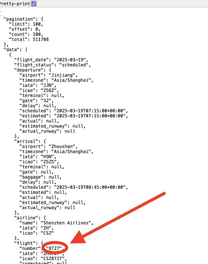 This button will query the API and load the JSON result into a separate browser tab. Make sure you toggle on “Pretty Print” to view the results. We’ll grab the number from the first flight loaded: